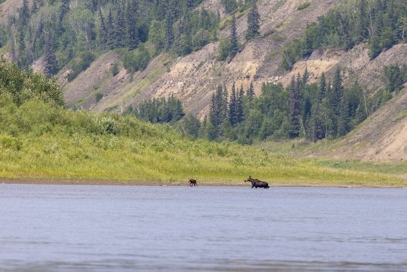 Locally known as Gord’s Beach, named for a gentleman who owns a trapline and cabin on the opposite riverbank, this spot offers a mix of sandy and rocky beach areas and plenty of space to stretch your legs. While there are few trees for shade or shelter, the beach provides striking views, including a large red iron deposit on the riverbank. This vivid red coloration comes from iron-rich sandstone. As the river erodes the layers, oxygen from the air and water reacts with the iron minerals, creating the bright red and rusty hues visible today.