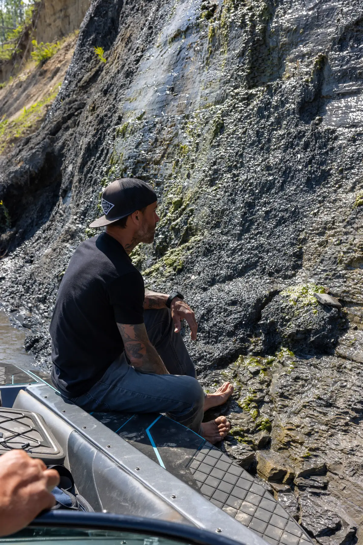 Locally known as Gord’s Beach, named for a gentleman who owns a trapline and cabin on the opposite riverbank, this spot offers a mix of sandy and rocky beach areas and plenty of space to stretch your legs. While there are few trees for shade or shelter, the beach provides striking views, including a large red iron deposit on the riverbank. This vivid red coloration comes from iron-rich sandstone. As the river erodes the layers, oxygen from the air and water reacts with the iron minerals, creating the bright red and rusty hues visible today.